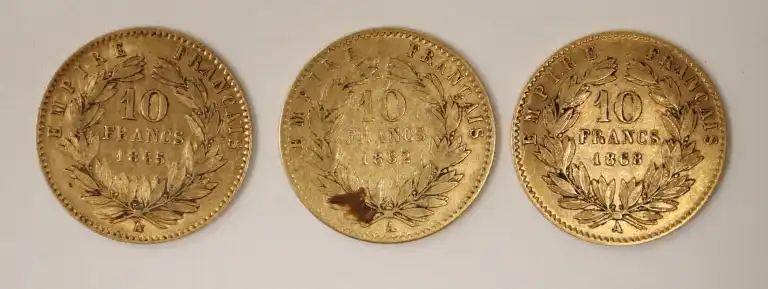 3 pièces de 10 Francs or Napoléon III tête laurée de 1862, 1865 et 1868.
