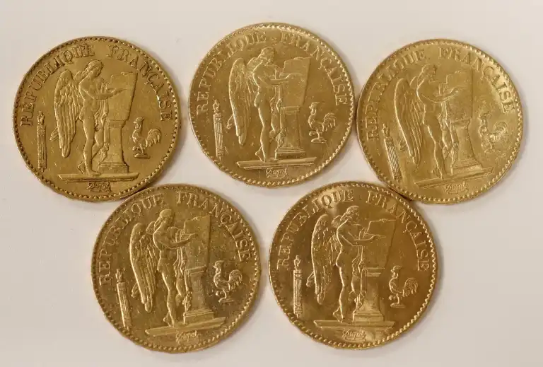 5 pièces de 20 Francs or au génie (A) comprenant : 1 x 1874, 2 x 1875, 2 x 1878.