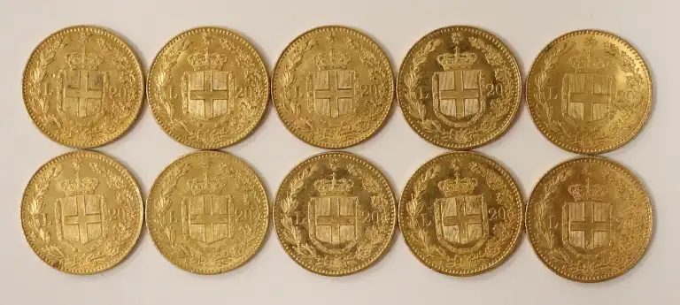 10 pièces de 20 Lires or Umberto I, Roi d'Italie de 1881, 1882 (x8), 1883