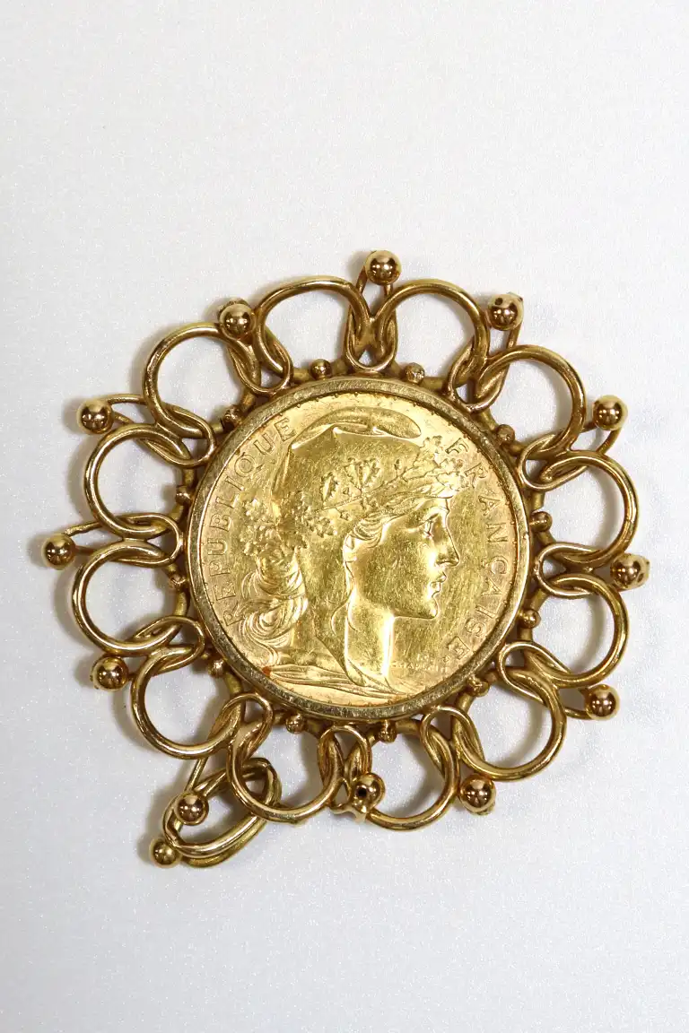 1 pièce de 20 francs or Marianne Coq montée en pendentif en or jaune 18K (750/1000). Poinçon Tête d'aigle. Poids : 12.7 g