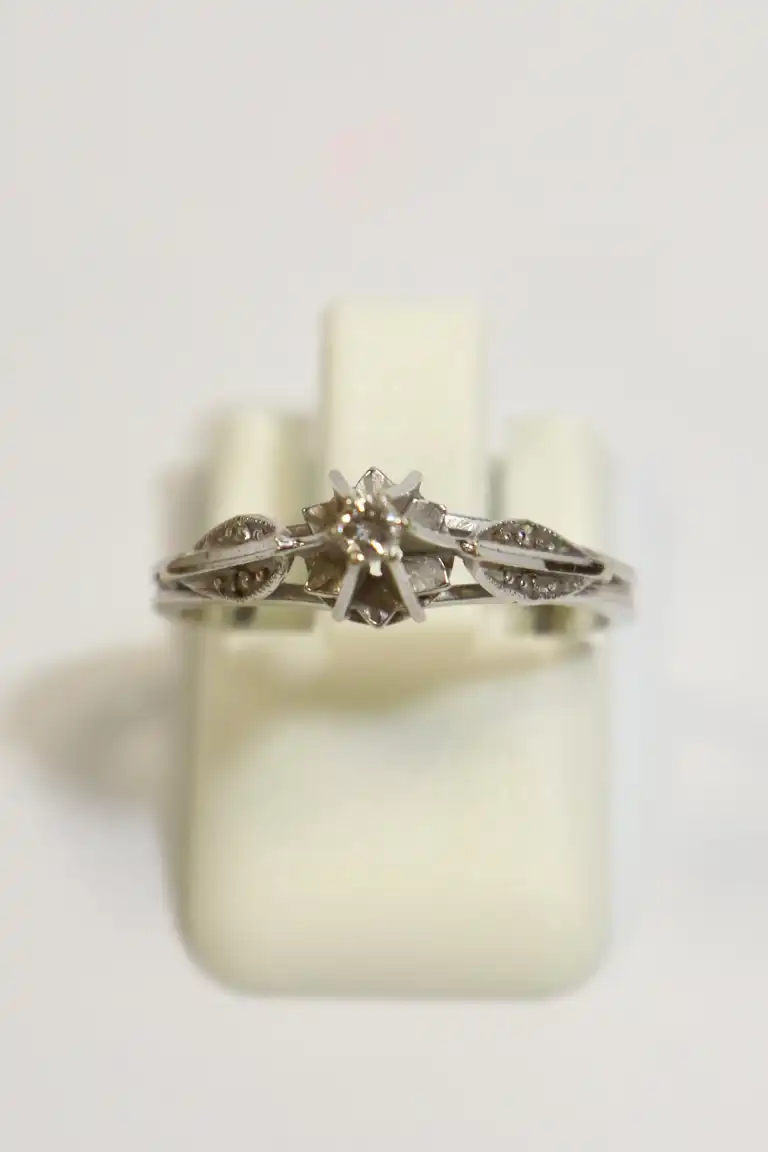 Bague solitaire en or gris 18 K (750) sertie d'un petit diamant. TDD : 49. Poinçon Tête d'aigle.