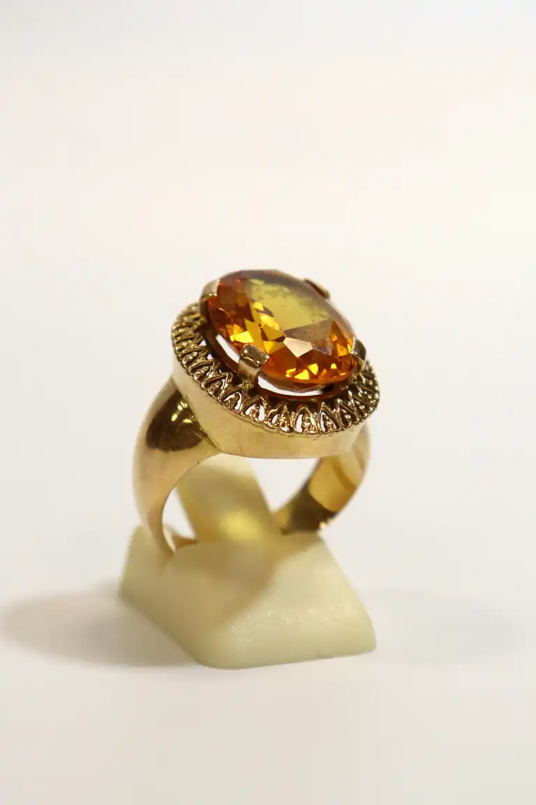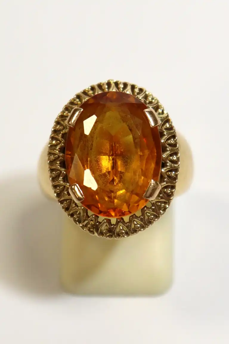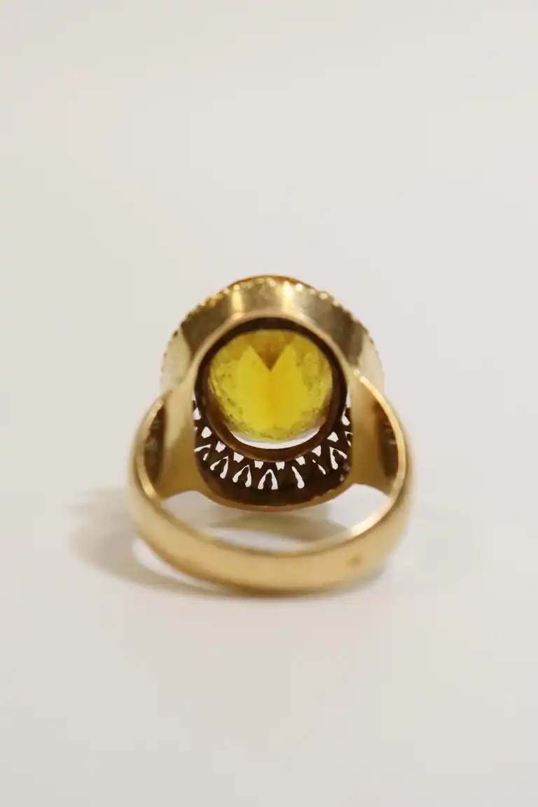 Bague en or jaune 18K (750) sertie d'une pierre probablement citrine de taille ovale (long.: 1.5 cm). TTD: 55. Poinçon tête d'aigle. Poids brut : 9.86 g