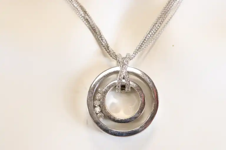 Collier chaîne à cinq rangs en or gris 18K (750), supportant un pendentif rond en or gris 18K à cinq brillants mobiles, la bélière pavée de brillants. Dans le goût de la maison Chopard collection Happy Diamonds. Poinçon hibou. Diam.: 31 mm. Poids de la chaîne : 9.73 g - Poids du pendentif : 26.60 g - Poids brut total : 36.32 g