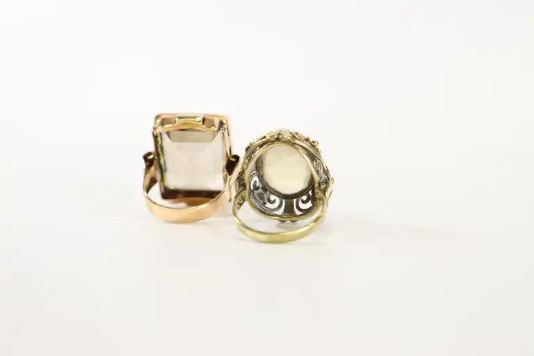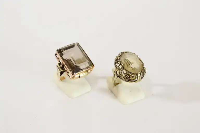Bague en or deux tons 14 K (585) sertie d'un quartz fumé (TDD : 50) et une bague en or 9K (375) sertie d'une quartz légèremment jaune (TDD : 49). Poids total brut : 16.07 g