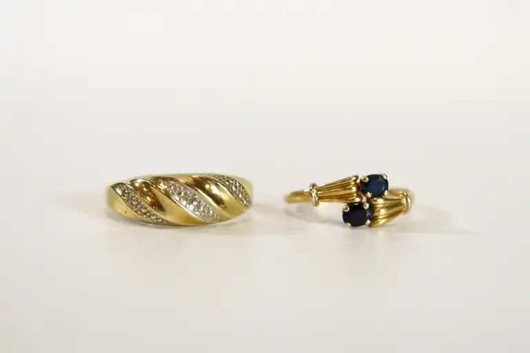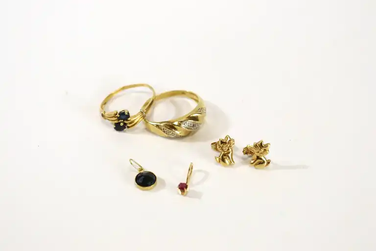 Lot de deux bagues, paire de puces d'oreilles et deux petits pendentifs en or jaune 18 K (750), sertis de petites pierres. Poids brut : 5.73 g