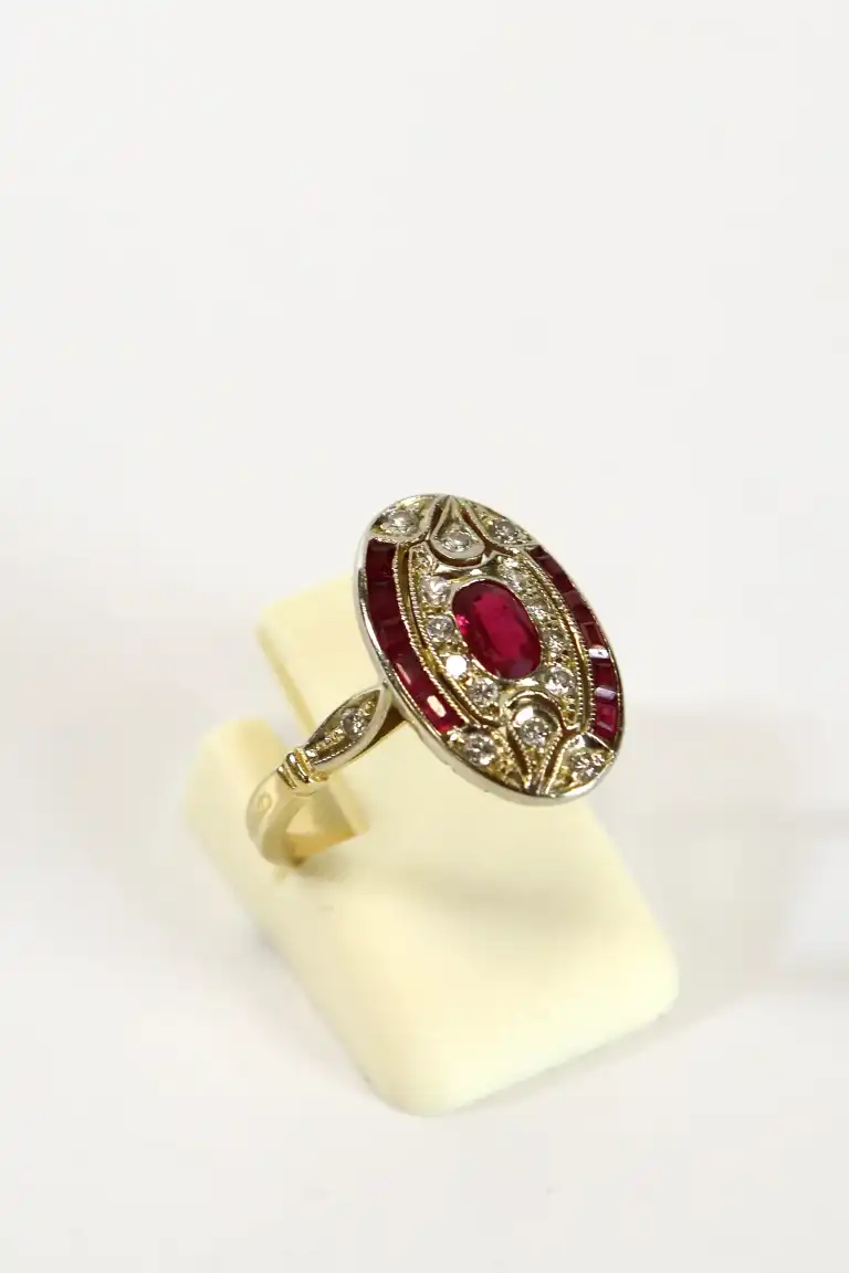 Bague en or jaune 18K (750) sertie de rubis et brillants. TDD.: 49. Poids brut : 3.59 g