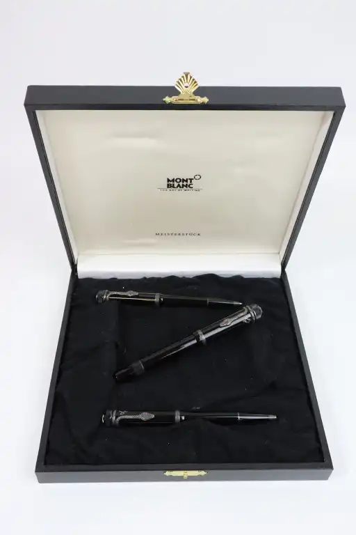 MONTBLANC. Meisterstuck. Modèle Agatha Christie. Parure de trois stylos en résine noire et monture en argent 925, l'agrafe à motif de serpent aux yeux sertis de pierres rouges, comprenant :
