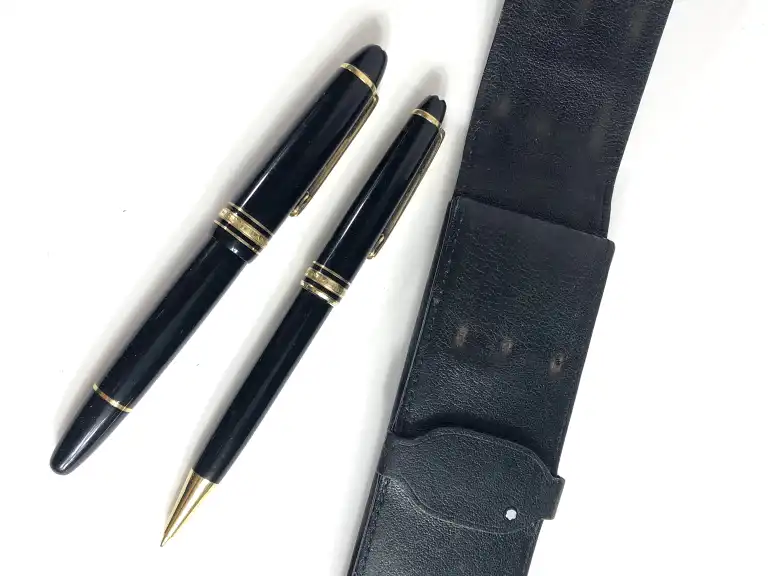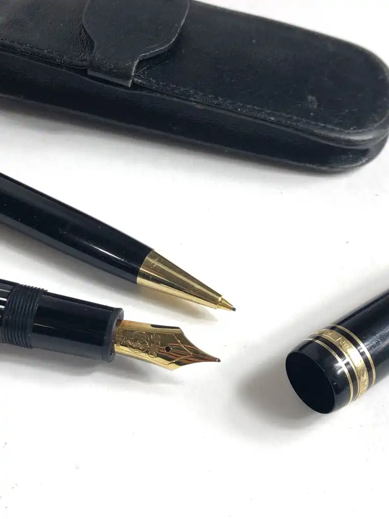 MONTBLANC. Stylo plume et porte-mine en résine noire et attributs en métal doré. La plume en or jaune 18 K (750).