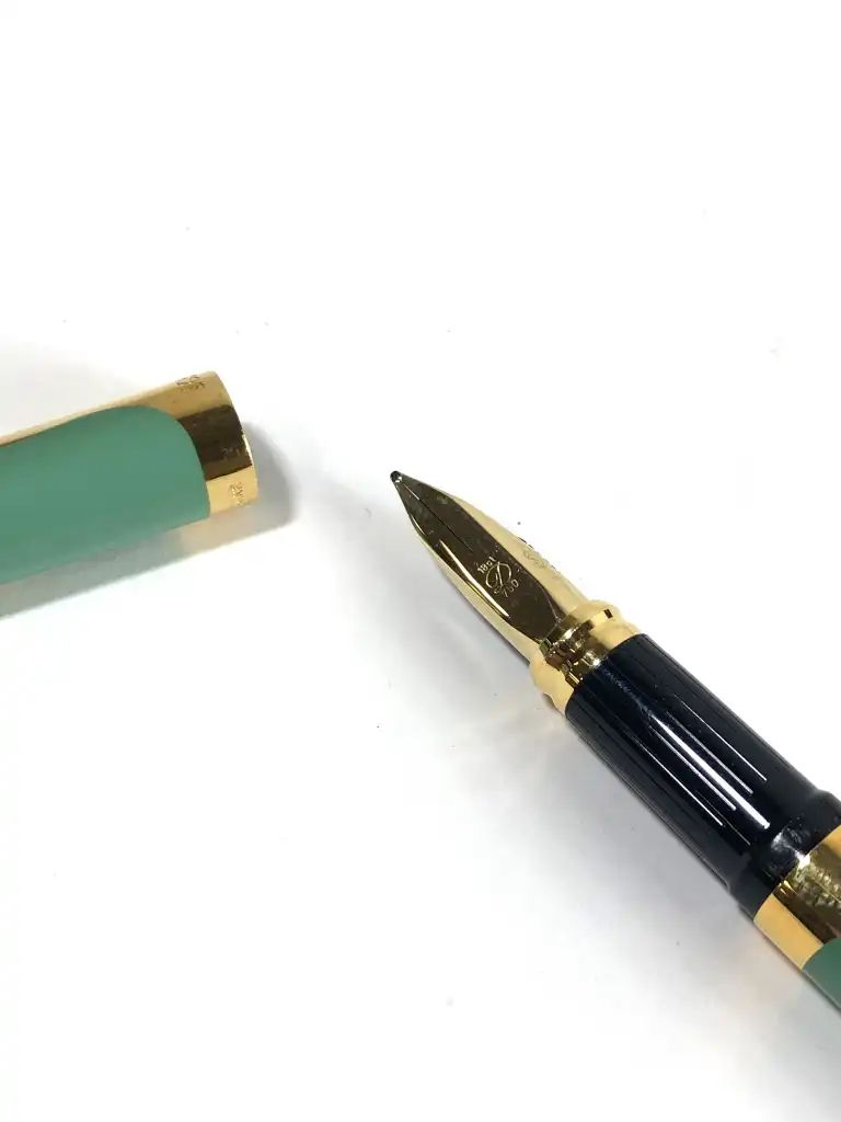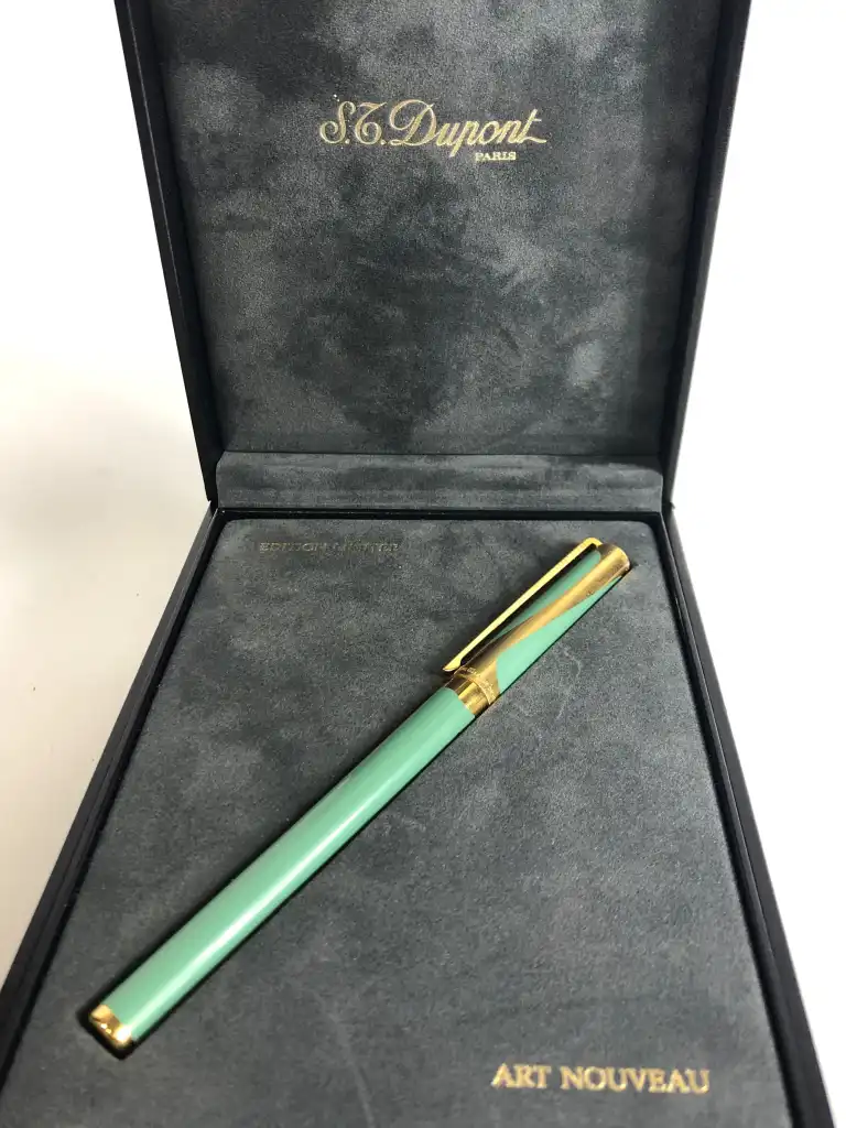 ST DUPONT. Modèle Art Nouveau. Stylo plume plaqué or et laque de Chine verte avec décor d'arabesques. La plume en or jaune 18 K (750) moyenne. Remplissage par cartouche ou convector. Edition limitée. Numéroté 1347 / 4000.