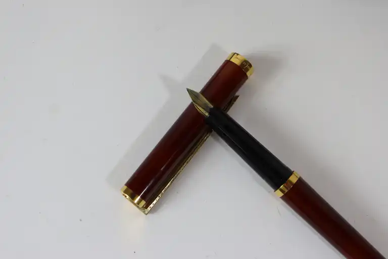 ST DUPONT. Stylo plume en laque de Chine couleur écaille et attributs en métal doré.