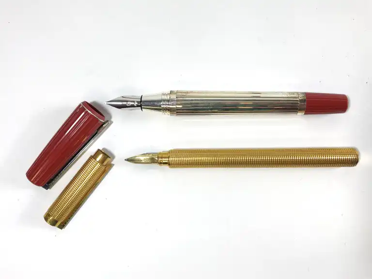 ST DUPONT. Lot de deux stylos, comprenant : - Modèle Saint Germain. Stylo plume plaqué argent en métal Palladium à stries, avec capuchon et embout en résine bordeaux. Numéroté.