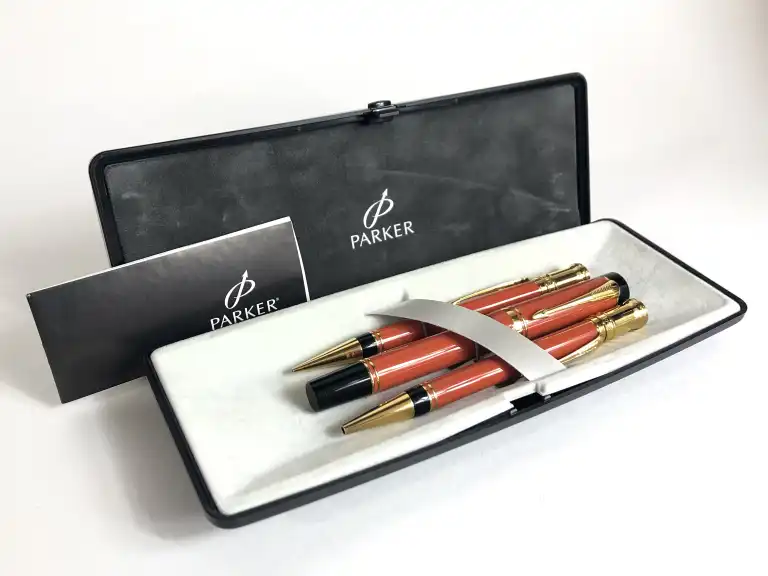 PARKER. Modèle Duofold. Parure de trois stylos, comprenant : stylo plume, stylo bille et porte-mine en résine orange. La plume en or bicolore 18 K (750).