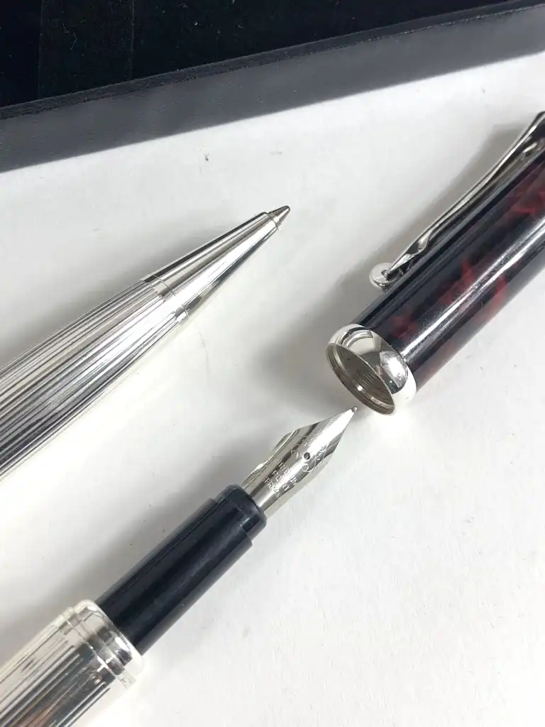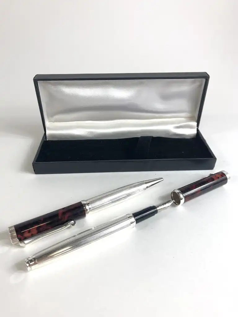 On joint : une parure de deux stylos (sans marque) en métal et laqué marbré, comprenant un stylo plume et un stylo roller. Dans un coffret.