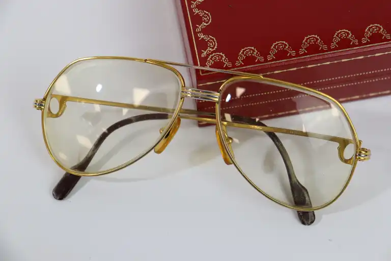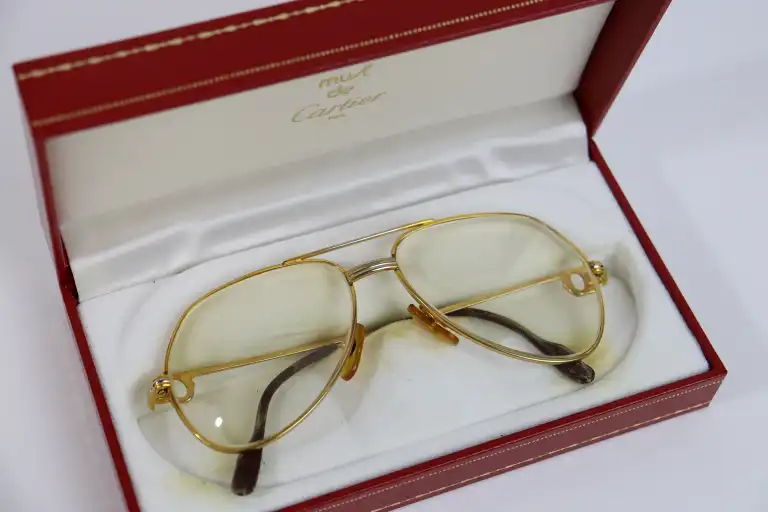 CARTIER. Modèle Vendôme, Must de Cartier. Paire de lunettes de vue en métal doré à motif du sigle ajouré sur les branches