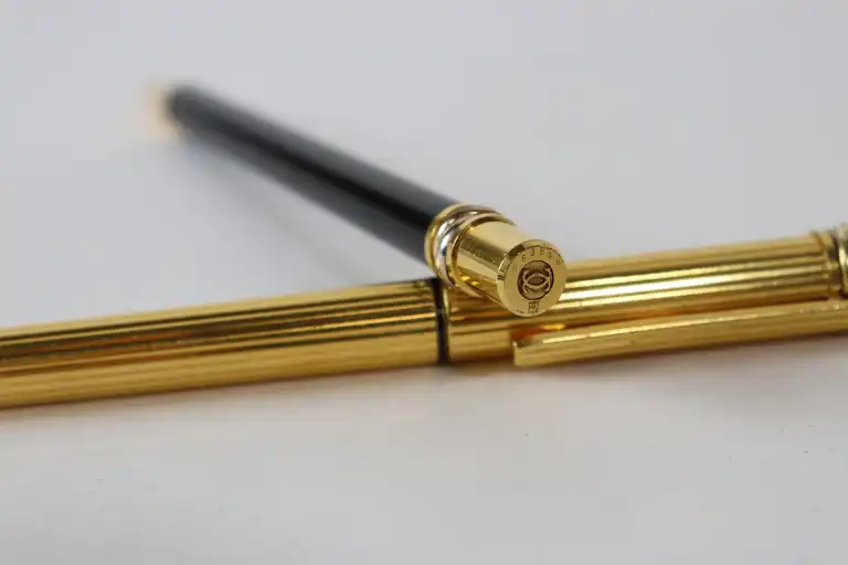 CARTIER. Modèle Must de Cartier. Lot de deux stylos : stylo roller en métal doré à cannelures et stylo billet en résine noire et métal doré. Les capuchons ornés du motif "Trinity". Numérotés.