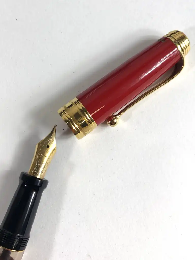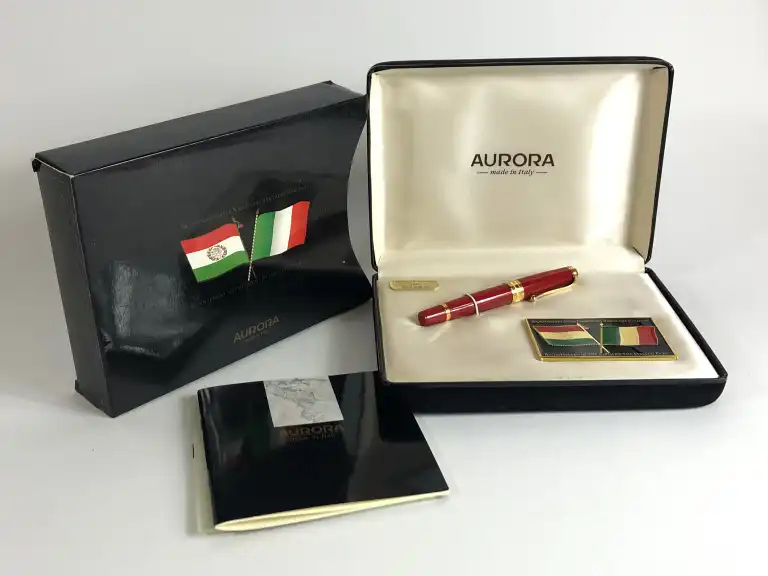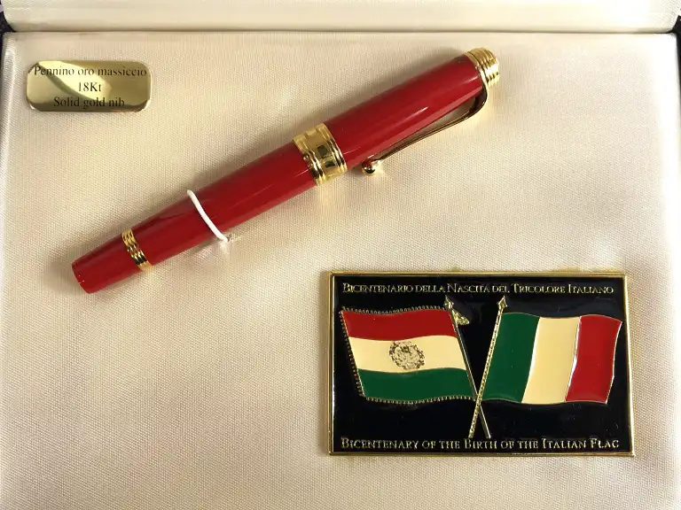 AURORA. Modèle "Bicentenario Della Nascita del Tricolore Italiano", Bicentenaire de la naissance du drapeau italien, 1797 - 1997. Stylo plume en résine rouge et attributs dorés. Plume en or jaune 18K (750), moyenne. Drapeau italien au sommet du capuchon. Bague gravée.