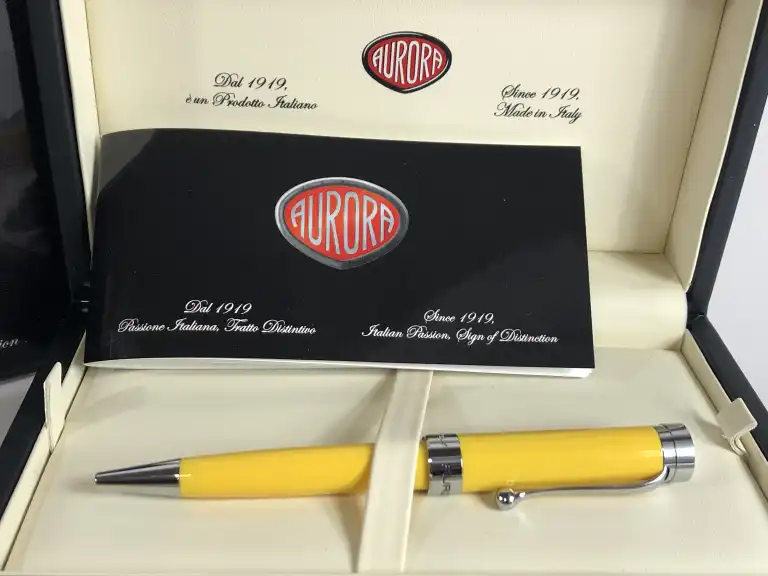 AURORA. Lot de 4 stylos, comprenant : - un stylo bille, modèle EDO 031-Y, en résine jaune et attributs acier. Dans un coffret de la marque avec livret/certificat et sur-boîte.