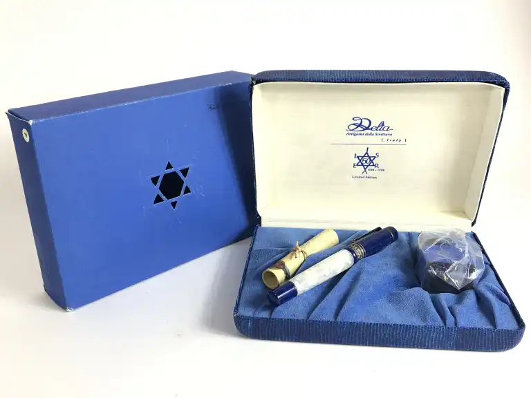 DELTA. Modèle Israël 50e anniversaire. Coffret comprenant un stylo plume à corps en résine blanche nacrée avec capuchon en résine bleu roi. Bandes et agrafe en argent Sterling. Plume en or bicolore 18 K (750). Edition limitée numéro 1646/1948.