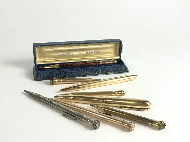 EVERSHARP. Lot de huit stylos comprenant : - un stylo plume corps en or 14 K (585) avec une plume en or jaune 14 K (585). (usé)