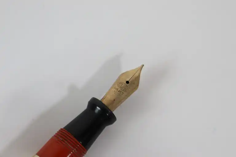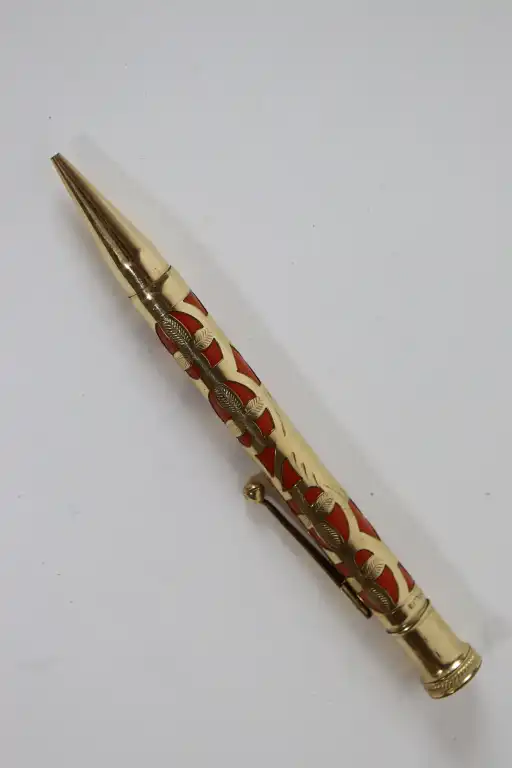 ECLIPSE. Parure en résine orange ornée d'une résille à motif de feuilles en métal doré, comprenant un stylo plume et un porte-mine. Levier latéral.