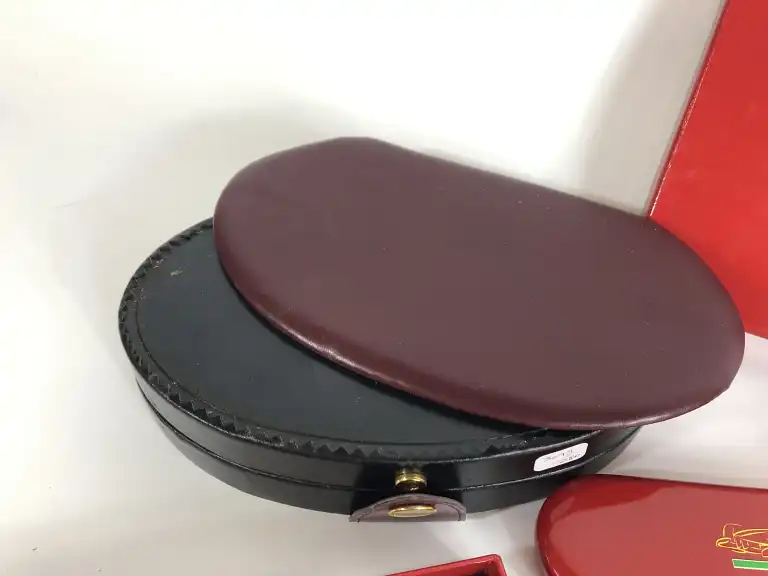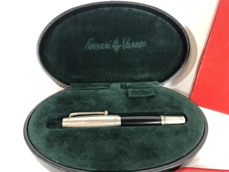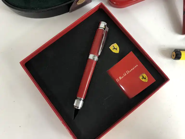 FERRARI. Lot de six stylos pour la marque, comprenant : - un stylo plume en résine noire, embout et capuchon en argent massif. Plume en or gris 18 K (750). (dans un coffret simili cuir en mauvais état)