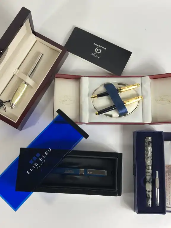 Lot de quatre stylos : - FIRENZE. Stylo plume en résine opalescente et veinage noir façon marbre. Décor en hommage aux artistes de la Renaissance à Florence. Dans son coffret avec fiche technique.
