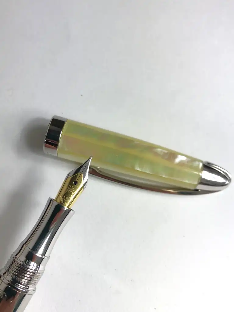 - LABAN. Stylo plume, à corps en argent 925 et capuchon en résine marbrée couleur ivoire.