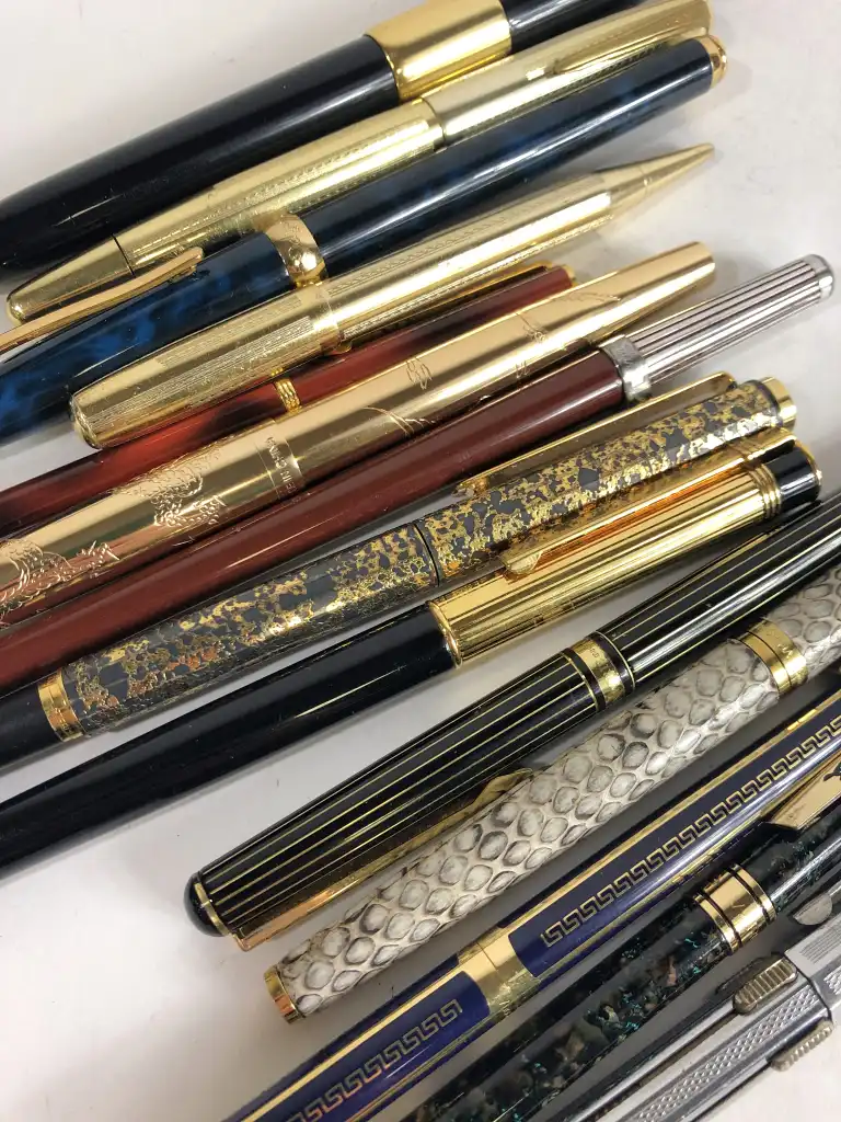 Lot de quinze stylos, comprenant : - ELYSEE. Stylo plume en résine bleu foncé et décor en métal doré à formes géométriques. Plume en or jaune 18 K (750)