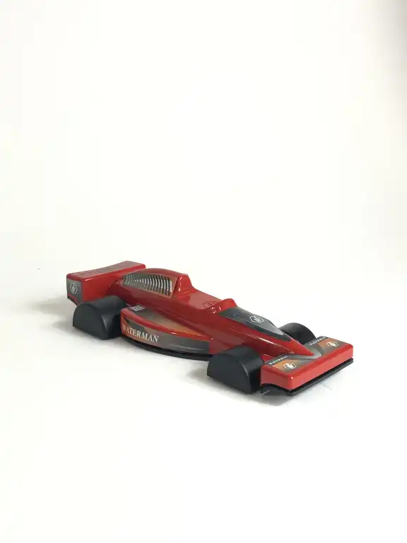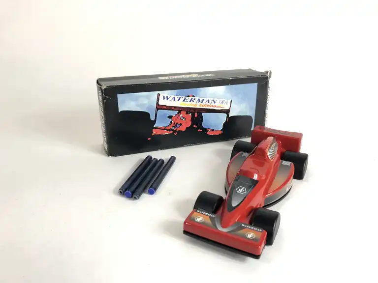- WATERMAN Racing Edition. Stylo plume en résine rouge dans son coffret en forme de voiture de course (abimée) et sur-boite (abimée)