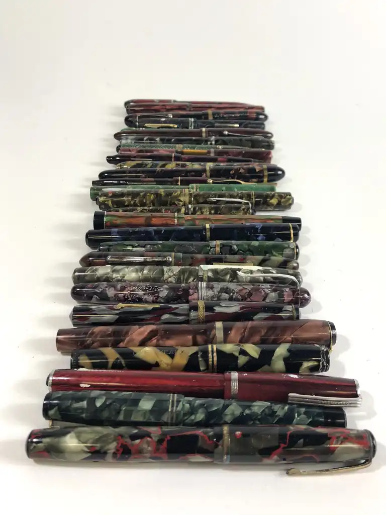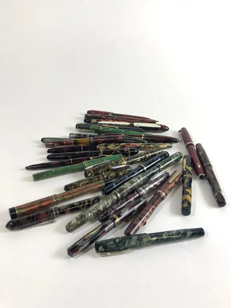 Lot de vingt-neuf stylos divers en résine colorée, comprenant vingt-cinq stylos plume et quatre porte-mines.