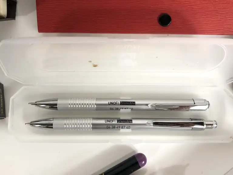 - une parure UNOFI d'un stylo bille et porte-mine dans son étui plastique transparent.