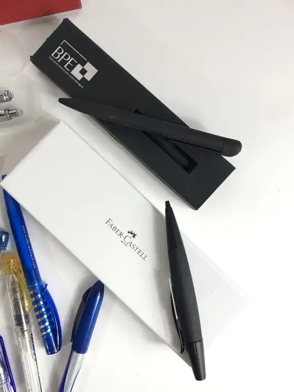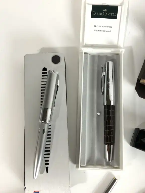 Lot d'environ trente stylos publicitaire et vingt-huit stylos mélangés, comprenant : - un porte-mine FABER-CASTELL, dans son étui cartonné avec sur-boîte et notice.