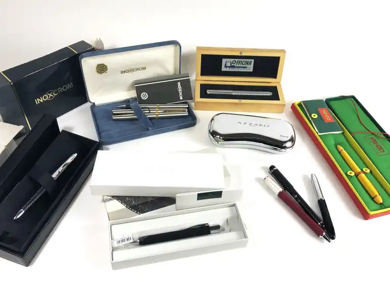 - INOXCROM, parure en acier comprenant un stylo plume, un roller et un porte-mine. Dans son coffret, notice et sur-boîte.