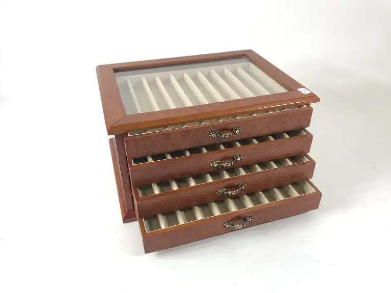 Coffret présentoir à stylos ouvrant à quatre petits tiroirs, le dessus vitré.