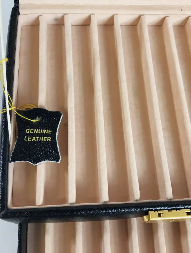 Lot de deux coffrets de présentation à stylos en cuir noir à 20 emplacements. (une clé manquante)
