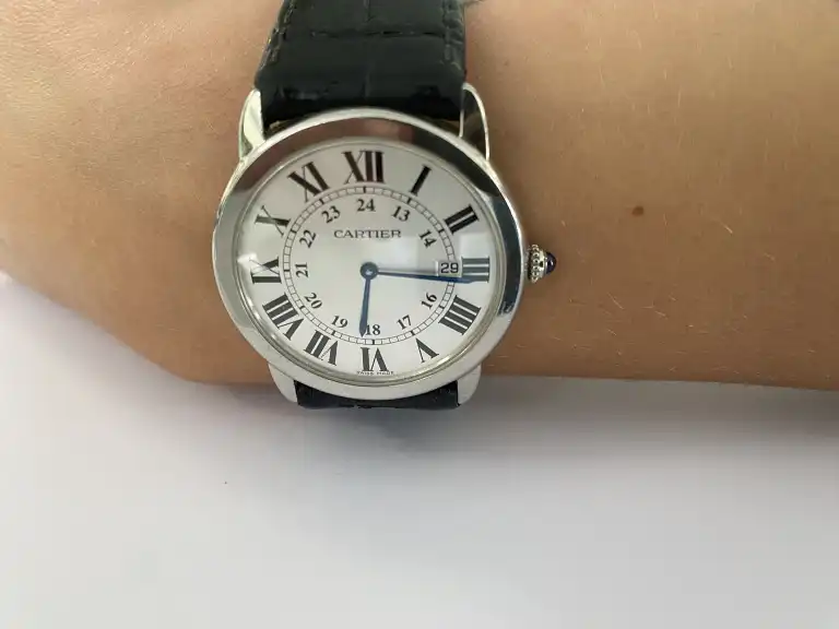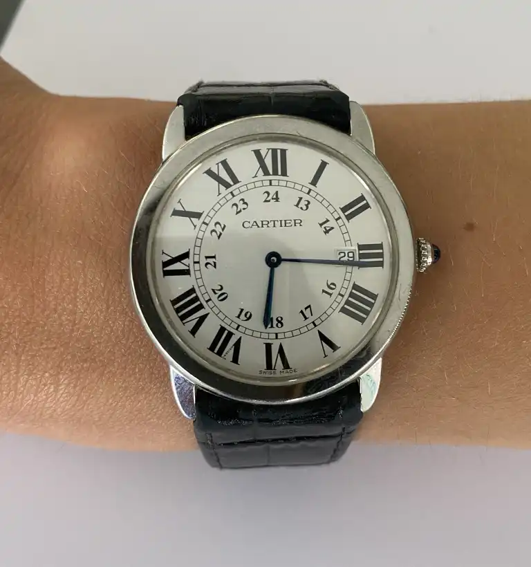 CARTIER. Modèle Ronde solo, réf.3603. Montre Acier, cadran rond émaillé à chiffres romains et chiffres arabes, guichet dateur à 3h. Bracelet cuir, boucle déployante métal. Diam.: 36 mm. (Usures au bracelet, infimes rayures au verre, petites rayures au boitier, état de fonctionnement non garanti).