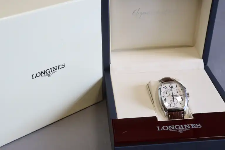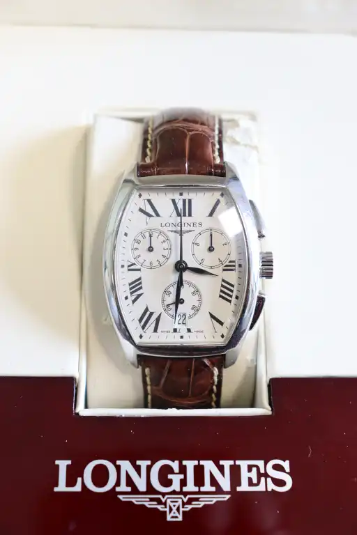 LONGINES. Modèle "Evidenza". Montre chronograph en acier, boitier tonneau fond crème à trois compteurs, chiffres romains pour les heures, minuterie chemin de fer, guichet dateur à 6h. Bracelet cuir et boucle déployante. 45 x 35 mm. Avec coffret et surboîte.