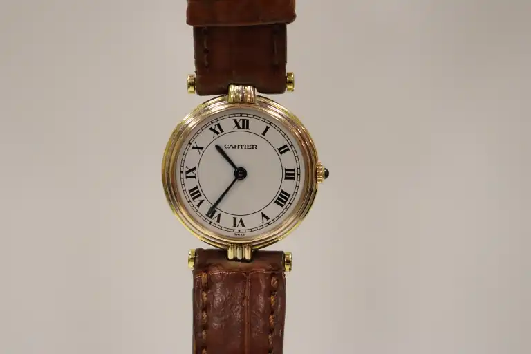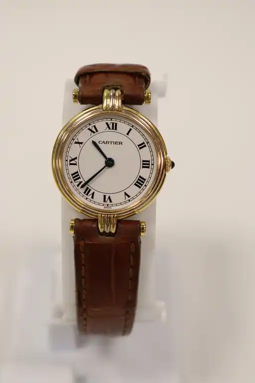 CARTIER. Montre en or 18K (750) de 3 tons, modèle "Vendôme Trinity", référence 881004, cadran rond à fond blanc, chiffres romains noirs, mouvement à quartz (calibre 690 : signé). Diam. du boîtier : 25 mm env., le dos signé et numéroté. La couronne de remontoir agrémentée d'un cabochon de pierre bleue. Bracelet postérieur rapporté en cuir caramel à boucle ardillon métal doré (usures). Poids brut : 19,8 g.