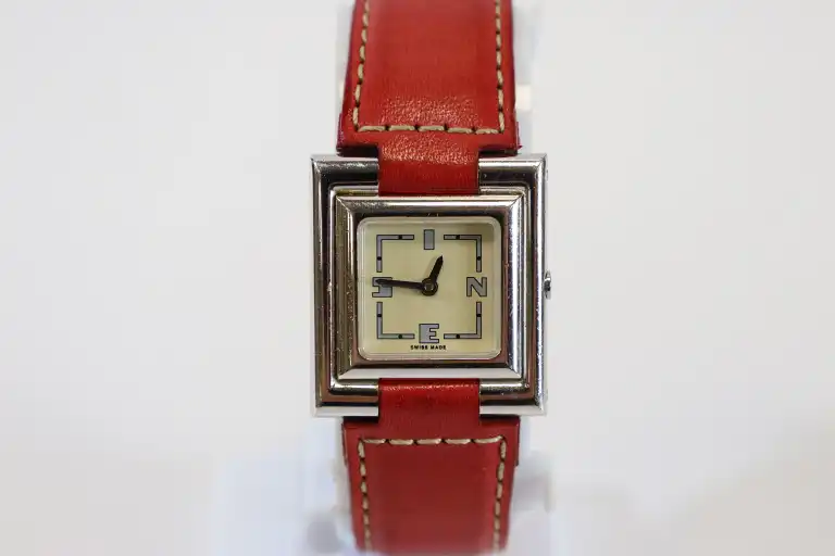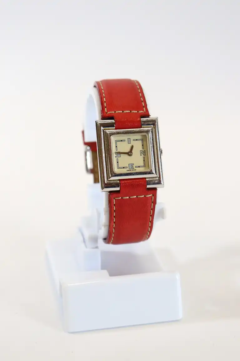 INES DE LA FRESSANGE. Montre bracelet de dame à boitier carré en en argent (925/°°), le cadran à index formé des lettres INES sur fond crème. Mouvement à quartz. Signée. Bracelet en cuir rouge piqué sellier beige signé et boucle ardillon en argent. Poids brut : 31 g