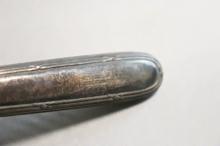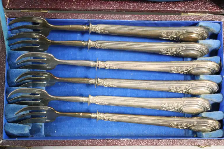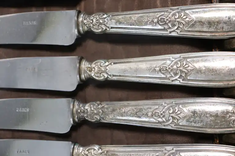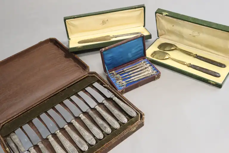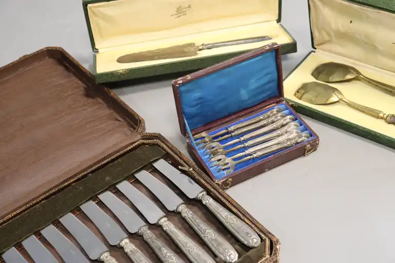 Lot en argent 925 comprenant : Six fourchettes à huitre en argent, manche en argent fourré, à décor de noeud de ruban et grappes de raisin. Poids brut : 135 g. Avec écrin; Une pelle à tarte, manche en argent fourré, lame en métal doré. Poids brut : 147 g. Avec écrin; Un couvert à salade, les manches en argent fourré, les cuillerons en métal doré. Poids brut : 226 g. Avec écrin; Onze grand couteaux et quatre petits couteaux, manches en argent fourré, lames en métal marquées Paris. Poids brut : 813 g. (Une lame accidentée sur un petit couteau).