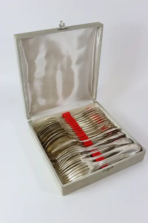 Partie de ménagère en argent 950/°°, modèle à la coquille comprenant : 12 fourchettes, 8 cuillères, 6 couverts à poisson. Poinçons : Minerve - M.O.: Louis COIGNET. Poids : 2320 g