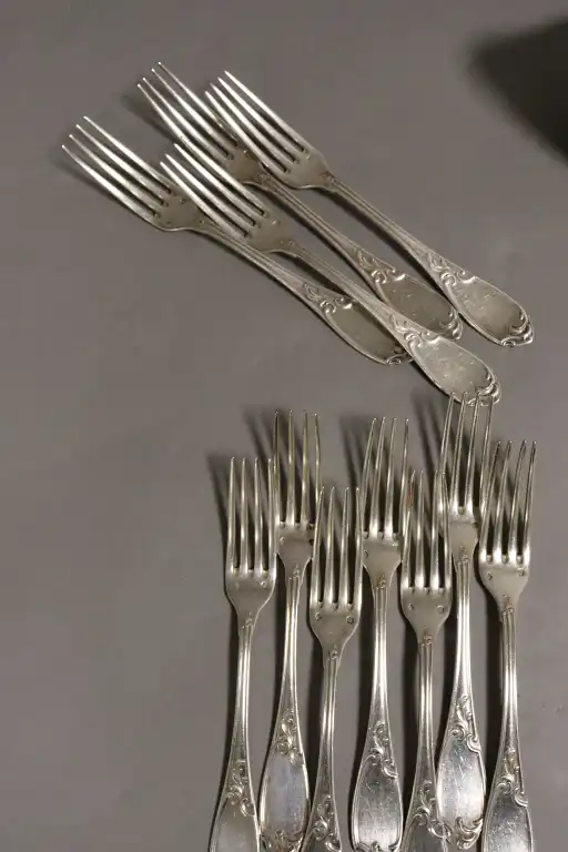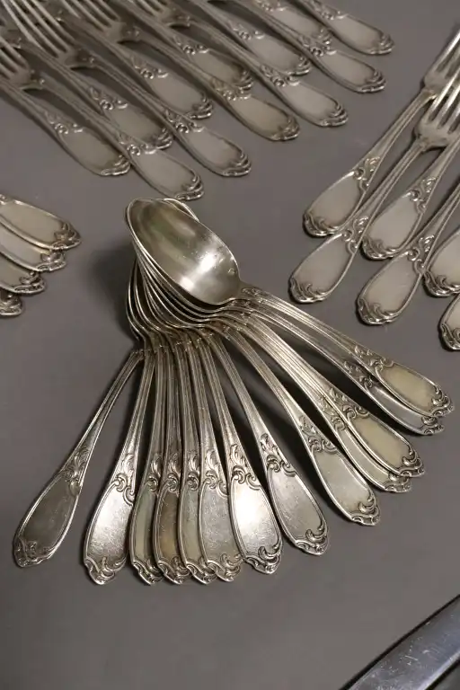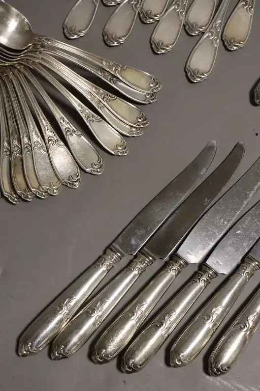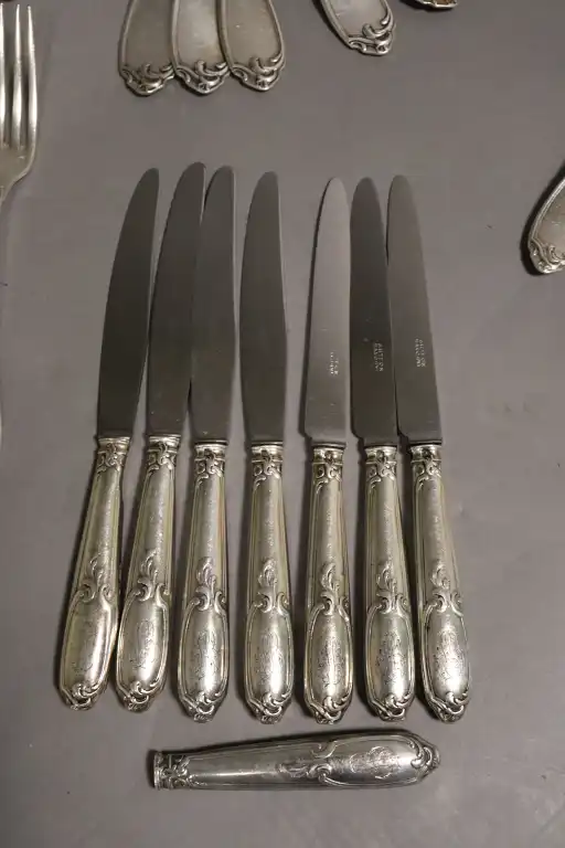 Ménagère en argent 950/°° comprenant : 21 fourchettes, 9 cuillères, 11 fourchettes à entremet, 13 cuillères à entremets, 13 grands couteaux, 7 petits couteaux (+1 manche). Monogrammé.