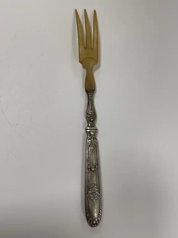 Coffret de cinq pièces de service à découper à manches en argent fourré, modèle de style Louis XVI. Poinçon Minerve. Poids brut total : 447 g.