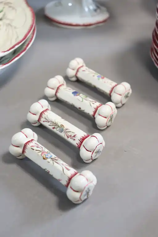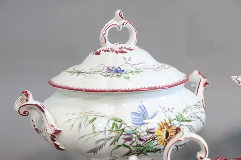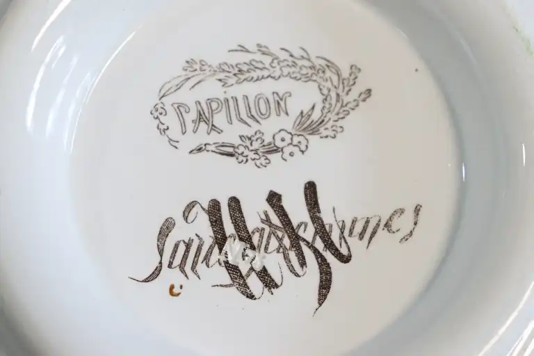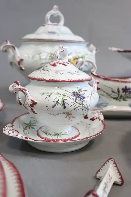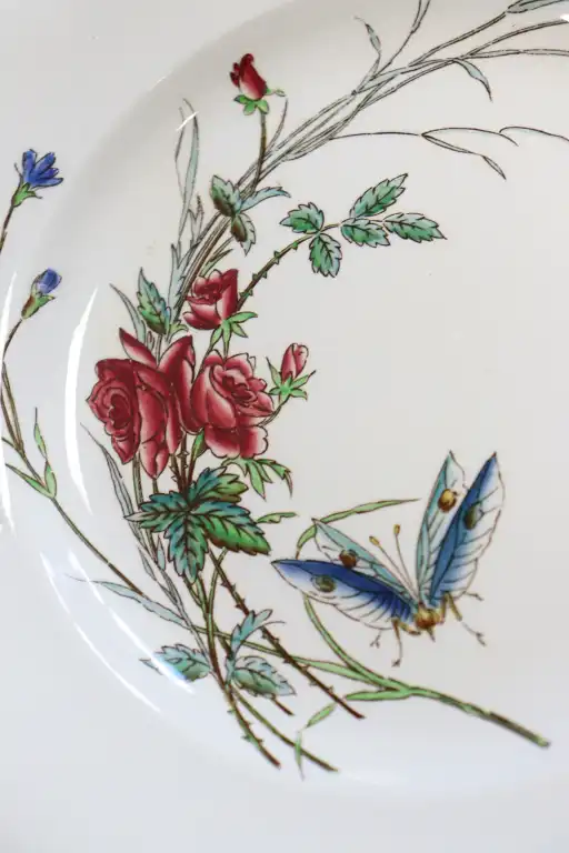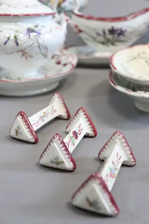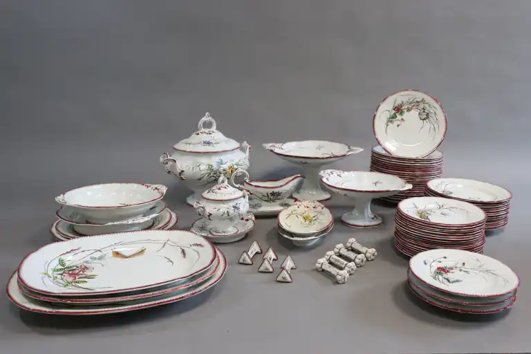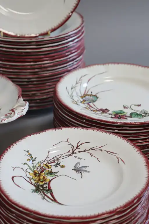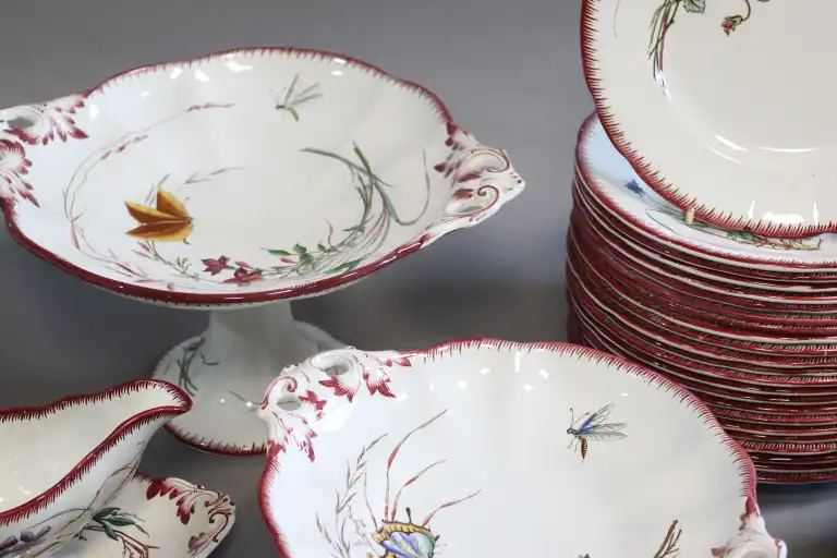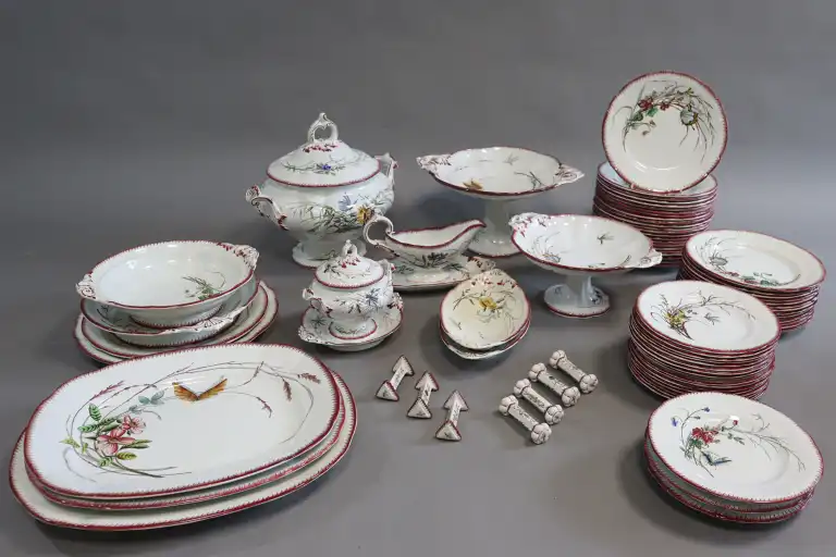 SARREGUEMINES. Modèle Papillons. Partie de service de table contenant 77 pièces dont : trente-six assiettes plates, dix-sept assiettes à dessert, trois assiettes sur talon, deux raviers, une saucière, un sucrier, une soupière, deux coupes à fruit, deux plats ronds, deux plats avec anses, trois plats rectangulaires, sept porte-couteaux. (Fêle sur un plat)