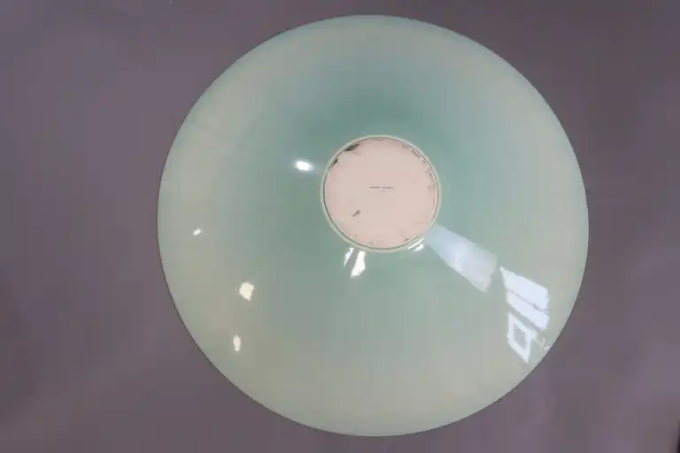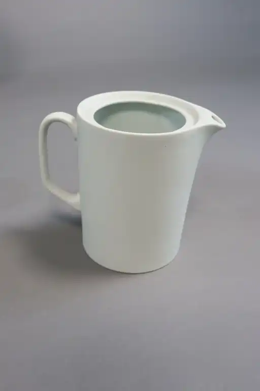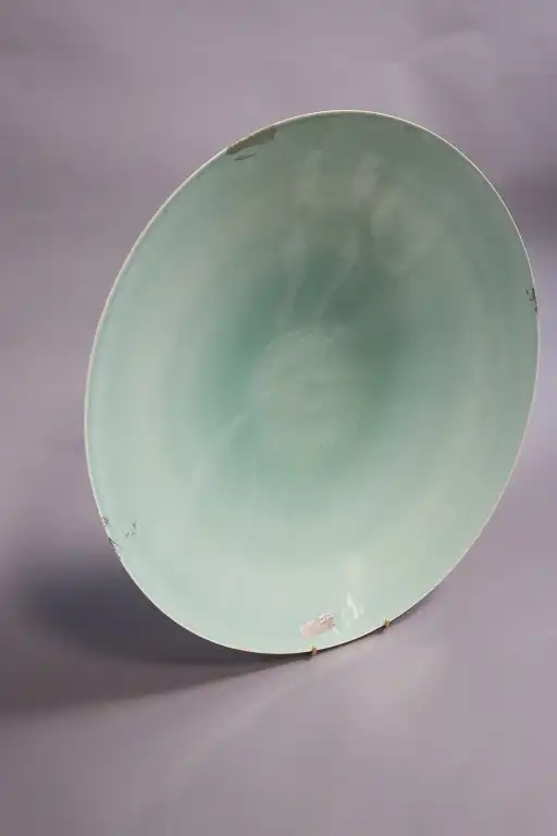 MURIEL GRATEAU (XXème - XXIème siècle). Ensemble de quinze pièces comprenant un large plat creux en porcelaine émaillée vert d'eau (D.: environ 53 cm) (Défauts de cuisson), un plat en grès tourné non émaillé blanc (D.: environ 40 cm), quatre tasses à thé en grès non émaillé bleu pâle, deux tasses à café en grès non émaillé bleu pâle, quatre soucoupes pour tasse à thé en porcelaine émaillée blanc, deux soucoupes pour tasse à café en grès émaillé blanc, une verseuse en grès non émaillé bleu pâle.