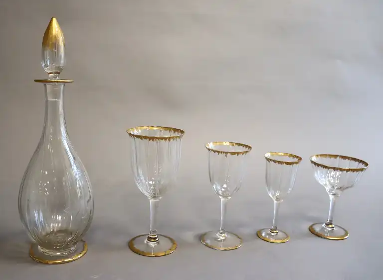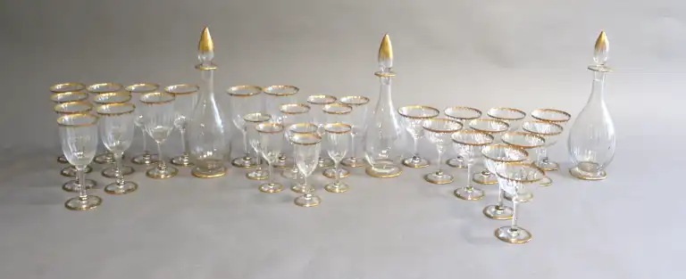 Etablissement LEGRAS. Modèle Yquem. Partie de service de verres en cristal (34 pièces) à décor de peignés dorés comprenant douze verres à eau, trois verres à vin rouge, cinq verres à vin blanc, onze coupes de champagne, trois carafes avec bouchon. (Usures, accidents).