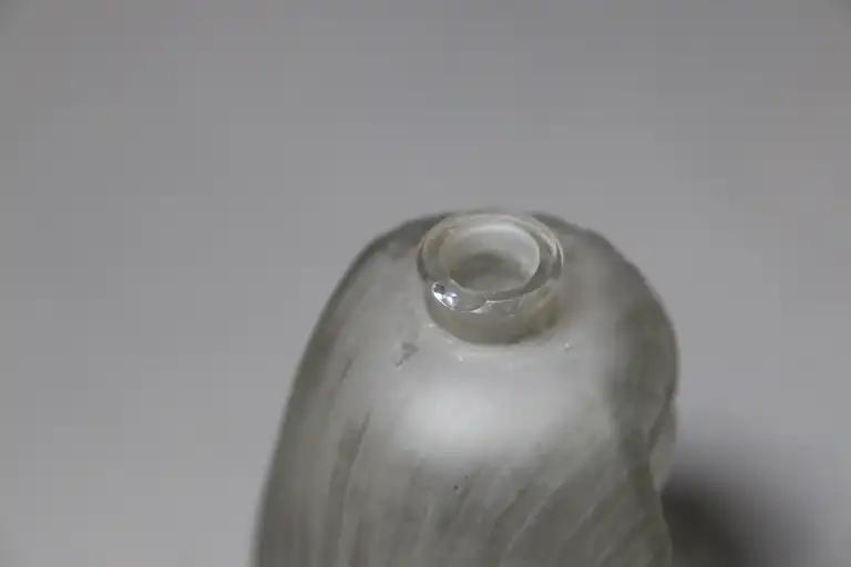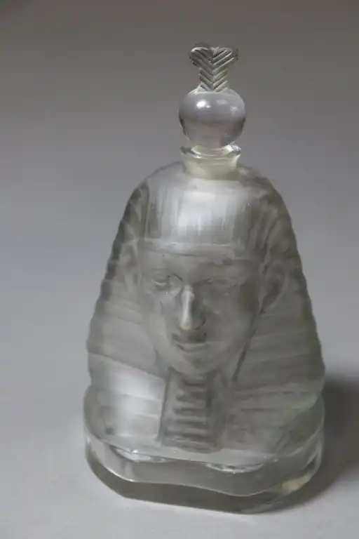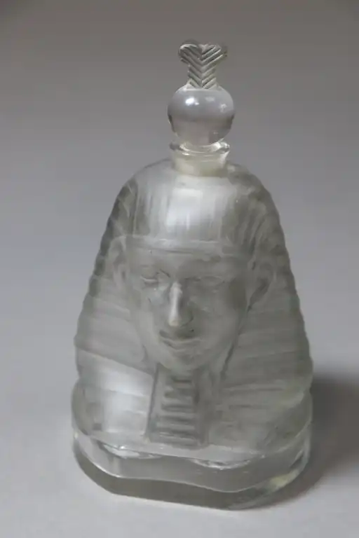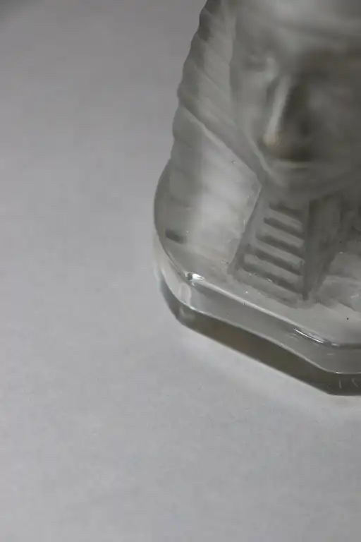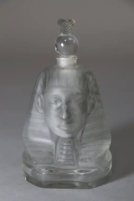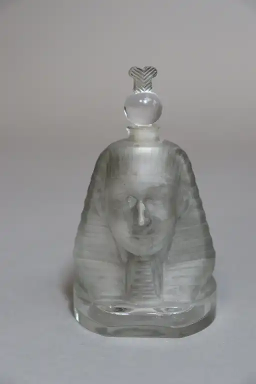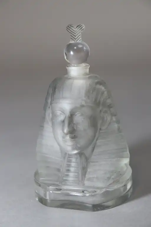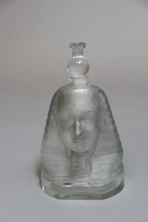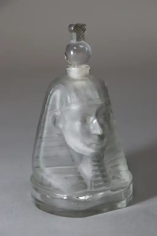 BACCARAT. Modèle « Ramsès IV ». Flacon en cristal moulé pressé, en partie dépoli, figurant la tête du pharaon, portant le pschent et la barbe, coiffé de la plume d'Horus, sur le bouchon. Signé sous la base « Baccarat ». Modèle créé par Julien Viard. Vers 1920. H.: 12.5 cm. (Petit éclat au col à l'arrière et sur la base à l'avant)