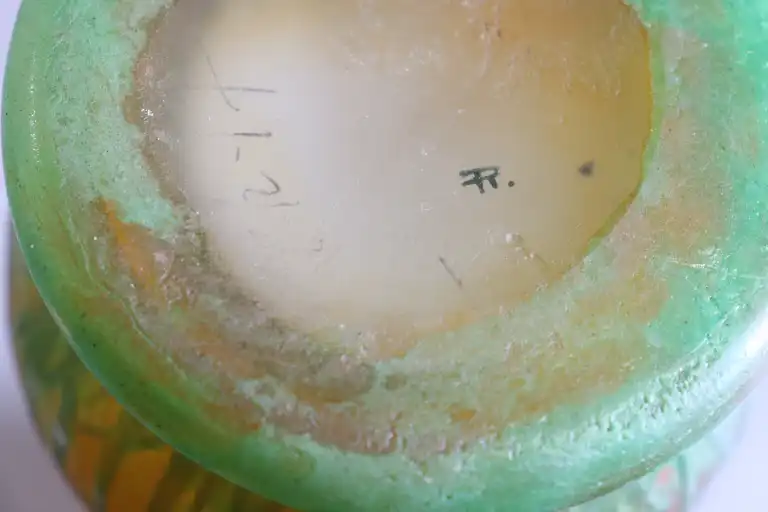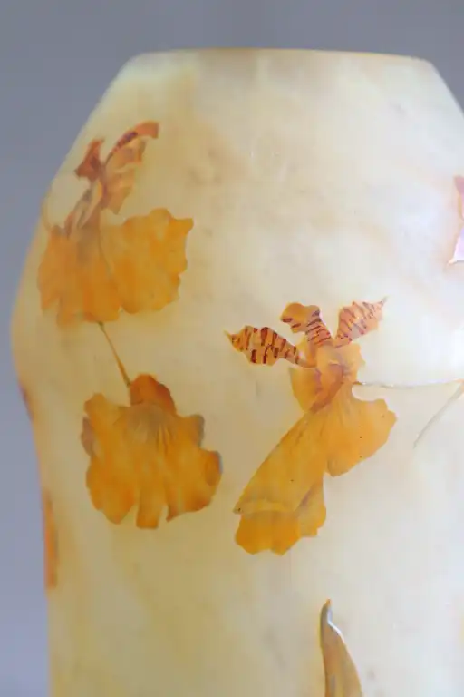 DAUM-Nancy. Vase en verre multicouche à décor dégagé à l'acide de fleurs d'orchidées "ophrys". Signé dans le décor Daum-Nancy à la croix de Lorraine, numéroté 1136 en-dessous de la signature. Monogramme "R" au-dessous. H.: 34.5 cm