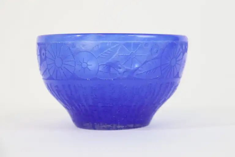 DAUM - NANCY France. Petite coupe en verre teinté bleu à décor gravé à l'acide de motifs végétaux stylisés sur fond givré. Signature "Daum # Nancy France" au-dessous. H.: 6.5 cm - Diam.: 11 cm
