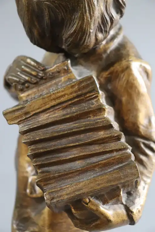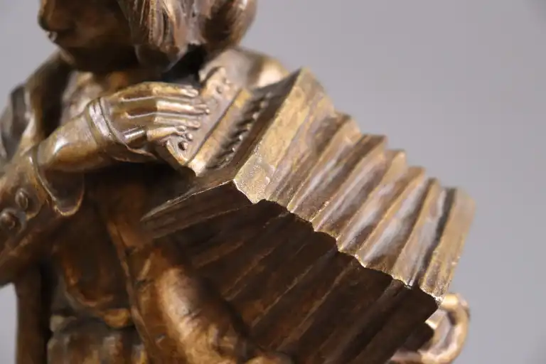Antoine BOFILL (né en 1875), d'après. Joueur d'accordéon. Epreuve en bronze à patine mordorée, signé en creux et porte une étiquette Marcel Roche / Rue Paul Chevenard / Lyon / Objets d’art Bijoux Artistiques . H.: 41 cm